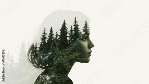 A profile portrait of a woman, with a forest overlaid subtly within her head, showcasing a thoughtful and serene composition.
