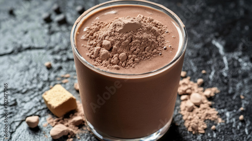 A protein sport shake is prominently displayed in a clear shaker bottle, showcasing its creamy texture and vibrant color.