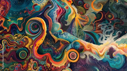 A psychedelic abstract artwork with swirling patterns and intense colors.
