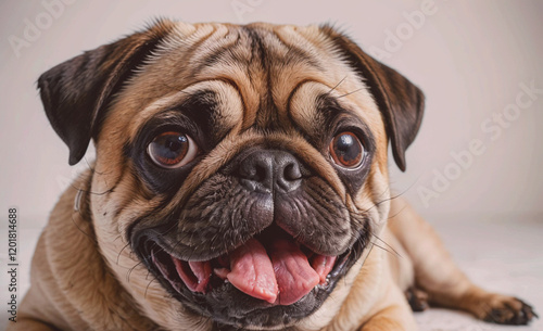 A pug dog is laying on the ground with its tongue out and its mouth open. The dog has a big smile on its face and he is happy