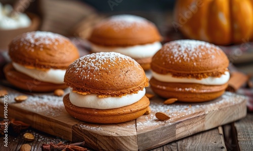 A pumpkin whoopie pies with a cream cheese filling on a rustic wooden board