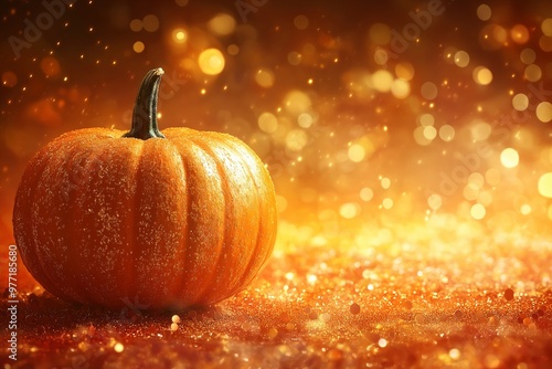 A pumpkin with a green stem sits on a table covered in glitter. The pumpkin is the main focus of the image, and the glitter adds a festive touch to the scene. The combination of the pumpkin