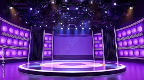 A purple-themed stage with circular platform, curved screens, and neon lights. Used in concert visuals, tech conferences, or award ceremonies.