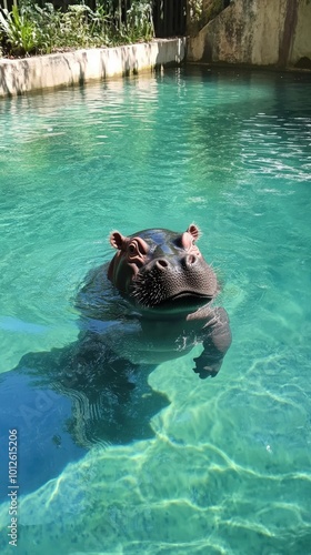 A pygmy hippo is seen swimming in a large pool, with its entire body visible from a long shot, enjoying the cool, refreshing water.