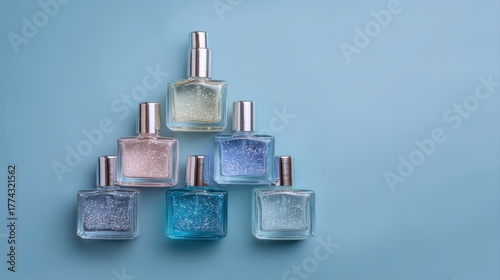A pyramid of six nail polish bottles with glittery finishes, arranged on a light blue background with a gradient effect.