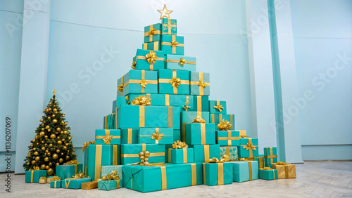 A pyramid of turquoise gift boxes with gold ribbons and bows, placed on a light background. Ideal for use in advertising gifts, festive events or seasonal promotions.