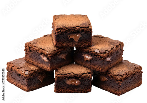 A pyramid stack of decadent chocolate fudge brownies with gooey filling inside.whitebackground,