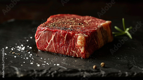 A quality cut of ribeye beef often marbled to add richness, a high-quality steak. For a restaurant, an unusual background.