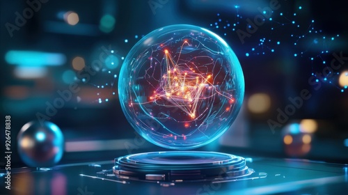 A quantum computer in a corporate setting visualizing complex business strategies, surrounded by digital data spheres,