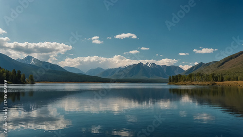 A quiet and peaceful lake with snowcapped mountains in the background.