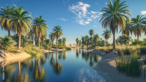 A quiet and peaceful oasis in a desert landscape, where the calm water reflects the clear blue sky and green palm trees line the shores.