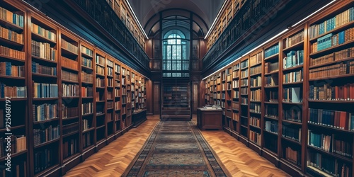 A quiet and spacious library with wooden shelves filled with many books, creating a warm and scholarly atmosphere.