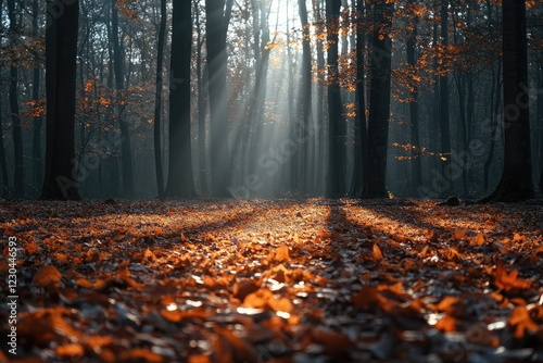 A quiet forest with a carpet of fallen leaves, the soft sunlight filtering through the trees, creating a peaceful and serene atmosphere