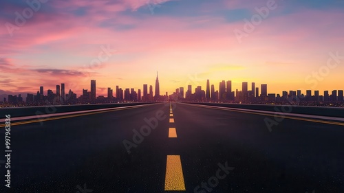 A quiet highway leading towards a glowing skyline, twilight hues blending with city lights, crystalclear 8K resolution, calm and serene ambiance