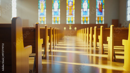 a quiet moment before service in an evangelical church, with empty pews and soft, diffused light streaming in through stained-glass windows