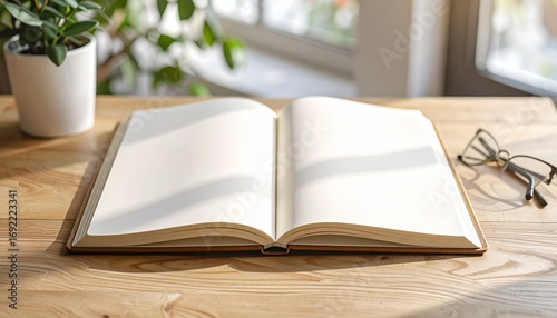A quiet moment for study or creativity with an open book, blank pages, and glasses on a sunlit wooden desk