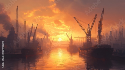 A quiet shipyard at dawn with cranes standing tall over calm waters and ships docked in the distance