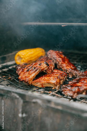 A rack of ribs and corn on a grill