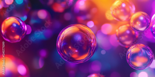 A radiant, colorful abstract background featuring translucent, glowing spheres floating in space. The soft, luminous orbs in deep violet, bright cyan, and shimmering orange create a futuristic, dreamy