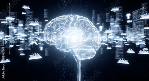A radiant digital brain surrounded by flowing information and open books symbolizes advanced learning and intelligence.