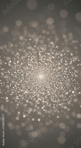 A radiant, light-filled design features a swirling cluster of tiny, glowing particles against a muted gray background.