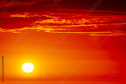 A radiant sunset over a forested horizon, with the sun casting a warm, golden glow across the sky and landscape. The vibrant orange and yellow hues create a stunning and tranquil scene. Copy space.