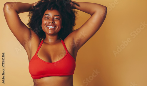 A radiant woman in a red top enjoys a carefree moment, her hands in her curly hair, embodying confidence and self-positivity against a warm backdrop.