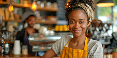 A radiant woman with a welcoming smile wearing an apron stands in her cafe