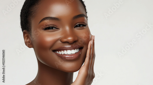 A radiant woman with smooth, flawless skin, gently resting her hand on her face while smiling warmly in a clean background