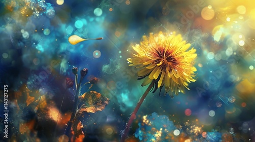 A radiant yellow dandelion surrounded by dreamy cosmic hues of blue and orange, with floating seeds captured in a whimsical and surreal light. AI generated.