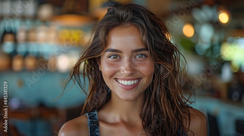 A radiant young woman with dark hair and a bright smile is set against a lively cafe background