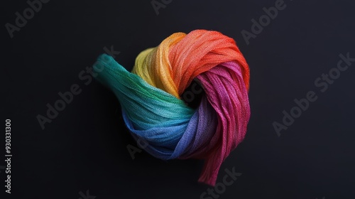 A rainbow-colored fabric pouf intricately coiled on a dark black background, highlighting the shades from red to violet and creating a striking, colorful contrast.