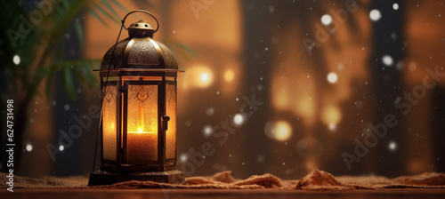 A Ramadan background of a Ramadan lantern with palm fronds in a room made