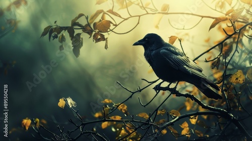 A raven sits perched on a branch in a misty forest, surrounded by autumn leaves. The bird is a symbol of wisdom, mystery, and the passage of time. The mist represents the unknown and the beauty of nat