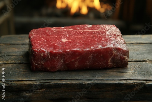 A raw cut of beef resting on a wooden surface, ready for cooking or preparation.