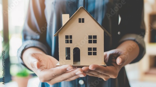 A Real Estate Agent Holds a Simple House Model in Both Hands and Hands It to a Client, Symbolizing Property Recommendations and Helping the Client Visualize Their Future Home in the Homebuying Process