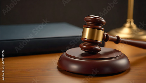 A realistic 3D model of a wooden judge's gavel placed on a round block, with a wooden background and a book