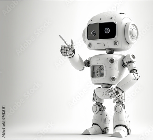 A realistic and modern white technological robot pointing an object, isolated on a white background. A promotional image with striking visual effects. Generative AI