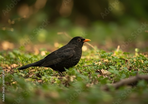 A realistic blackbird with a vibrant orange beak stands alert in a natural, leafy forest setting.