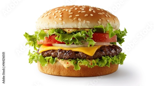 A realistic burger with layers of lettuce, tomato, and cheese on a white background.