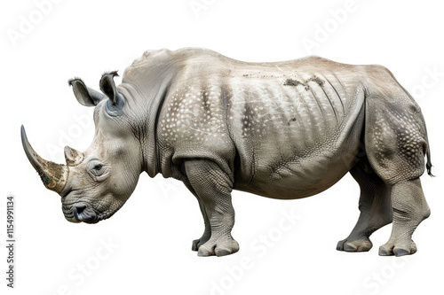 A realistic depiction of a rhinoceros showcasing its unique features and textures. isolated on white background