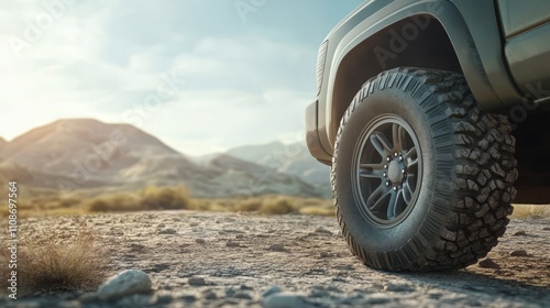 A realistic depiction of a spare tire mounted under a pickup truck, set against a clear outdoor backdrop