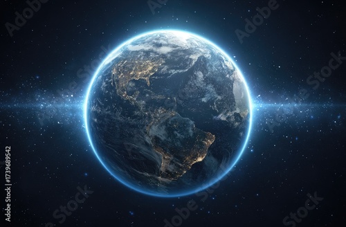A realistic depiction of Earth in space, illuminated by a celestial glow and starry background