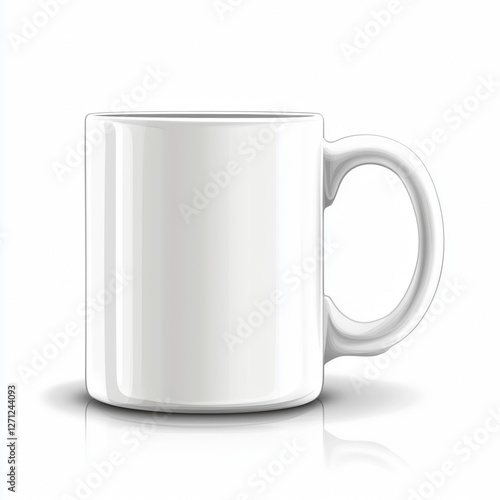 A realistic illustration of a plain white ceramic mug with a simple handle, featuring a smooth glossy surface, subtle light reflections, and shadows on a clean white background.