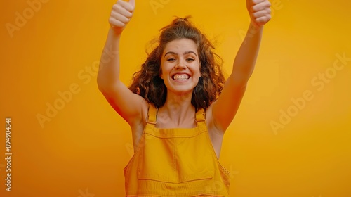 a realistic image of an excited young woman standing against an orange background, giving a thumbs-up to signify success and satisfaction
