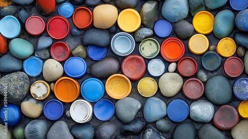 A realistic photo of colorful plastic bottle caps scattered on a rocky beach, showing sharp textures and vibrant tones.