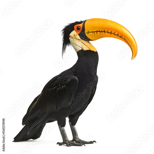 A realistic portrait of a magnificent hornbill standing in profile, isolated on a white background. Its glossy black feathers, large curved yellow-orange beak, prominent casque, and sharp dark eyes
