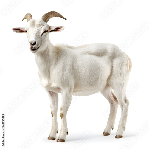 A realistic portrait of a sturdy goat with short white and light brown hair, curved horns, and bright eyes. The goat stands confidently in a full-body side view, isolated on a white background,