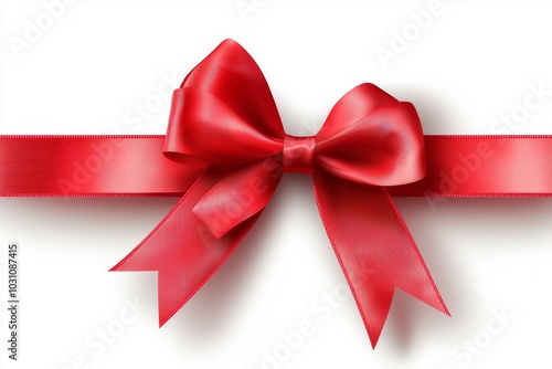 A realistic red bow with black satin ribbon is placed on the corner of a white background with a shadow.
