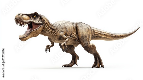 A realistic rendering of a roaring Tyrannosaurus Rex dinosaur against a white background, displaying details of its muscular anatomy.